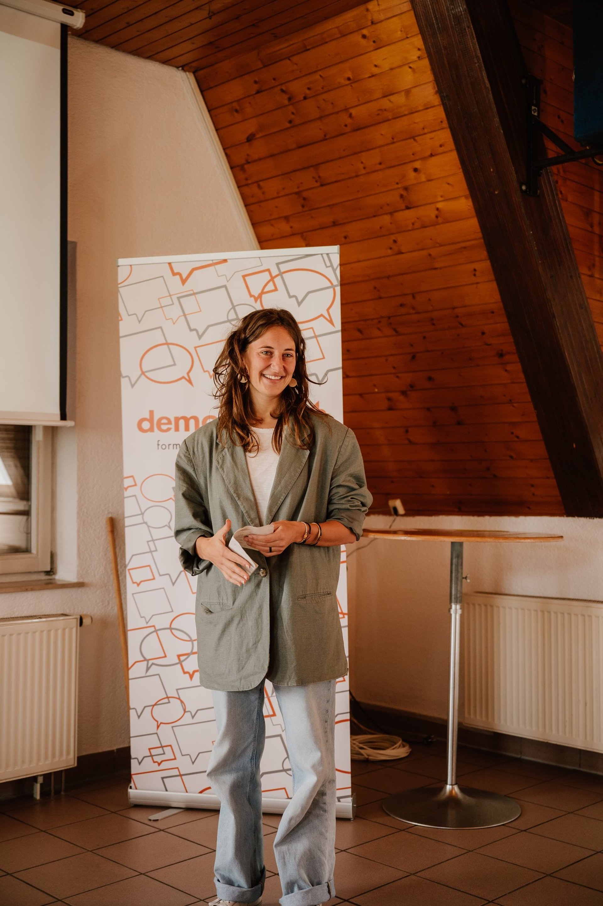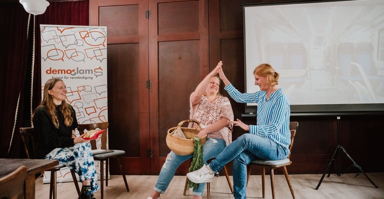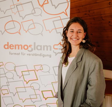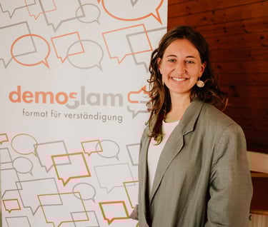 "Ich bin überzeugt davon, dass Menschen grundsätzlich zur Empathie fähig sind und sich nach Verbundenheit sehnen – auch dann, wenn Unterschiede und Konflikte dazwischenstehen. Als demoSlam-Trainerin und Moderatorin gestalte ich Räume, in denen Menschen sich zeigen, einander zuhören und neue Perspektiven ausprobieren können. Wichtig ist mir, dass sowohl Leichtigkeit als auch Tiefe Platz haben: Humor darf sein – und gleichzeitig bleibt das, worum es geht, ernst genommen."
